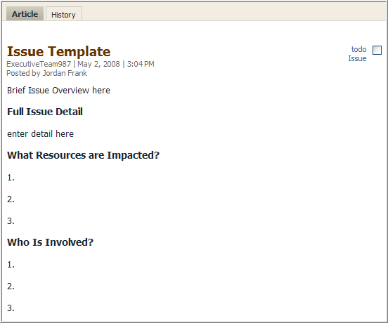 To create an article template in Traction, simply publish an article with the tags, title and body text that you'd like to see others use as a starting point. As needs evolve, this template is easily edited.