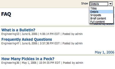 Here's an example showing how tags work. In this case, the FAQ tag in an Engineering space was clicked. You can see that there are three matches. The Add to This Topic button in the upper right makes it easy to add a new article tagged FAQ and it will show up in this area.