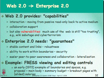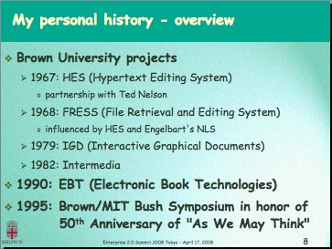 On April 17, 2008 Professor Andy van Dam of Brown University delivered the keynote address of the Enterprise 2.0 Summit 2009 Tokyo. Andy's title is a play on Vannevar Bush's July 1945 essay As We May Think. As We May Think inspired creation of pioneering hypertext systems by Andy, Ted Nelson, Doug Engelbart and others, leading to Tim Berners-Lee and the World Wide Web. The creators of these hypertext systems originally envisioned an environment where individuals could write, link, comment on and share what they wrote as well as search and read what others had written - core capabilities of what we now call social software for the public Web or an Enterprise. Andy's keynote is a personal history, and a vision of how the Web provides a new context for work as well as public communication, socialization, commerce, scholarship and entertainment. For the full slide set see As We May Work (.ppt 8.8MB), posted here with Andy's permission.