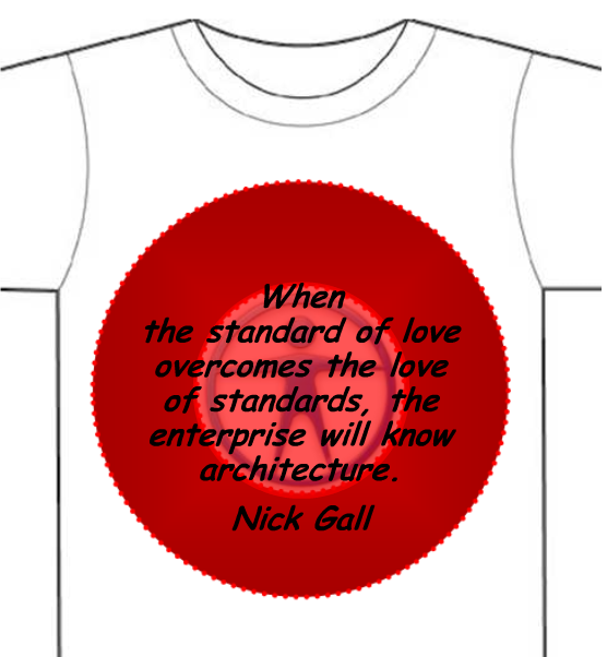 Separately, I got in touch with Nick Gall (an enterprise architecture and design thinker at Gartner) after watching Introducing Hybrid Thinking where he opened by saying "all too often we are doing architecture to people rather than architecture for people." He comes back to his foundational point in the conclusion of his talk by showing the T-Shirt pictured here. I think its a brilliant reminder that the goal of IT is for human productivity, with a balance of consideration of standards, rather than the other way around. This sounds like E2.0 (doing architecture for people) vs. E1.0 (doing architecture to people). I reached out to Nick figuring he would be keen on concepts of a Social Architect or Social Process Engineer who may lay foundations where emergent work could achieve best returns. Turns out he prefers the metaphor of a Farmer or Gardener, but the semantic debate will take me too far into the weeds.