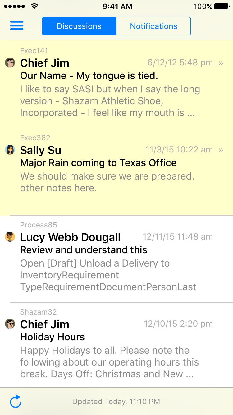 The list view showing notifications and discussions uses a new unread tracking capability built into TeamPage and synchronized with the iOS application to give you a snippet of the next unread message in the thread, while showing you the avatar of the person who posted it.