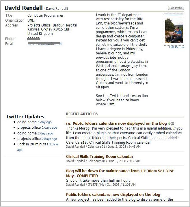 Rendall added a picture and a bit of a bio. He merged Comments into his Recent Articles section and added a Section which simply uses an iFrame widget to display his Twitter updates. The integration of the Web based Twitter service with his intranet based Traction TeamPage User Profile brings these technologies together to serve NHS staff needs.