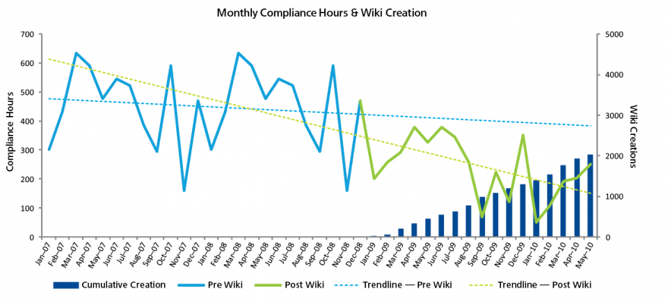 This graphic explains the very direct impact between the reduced time spent on compliance activities as the number of wiki pages were created in TeamPage.