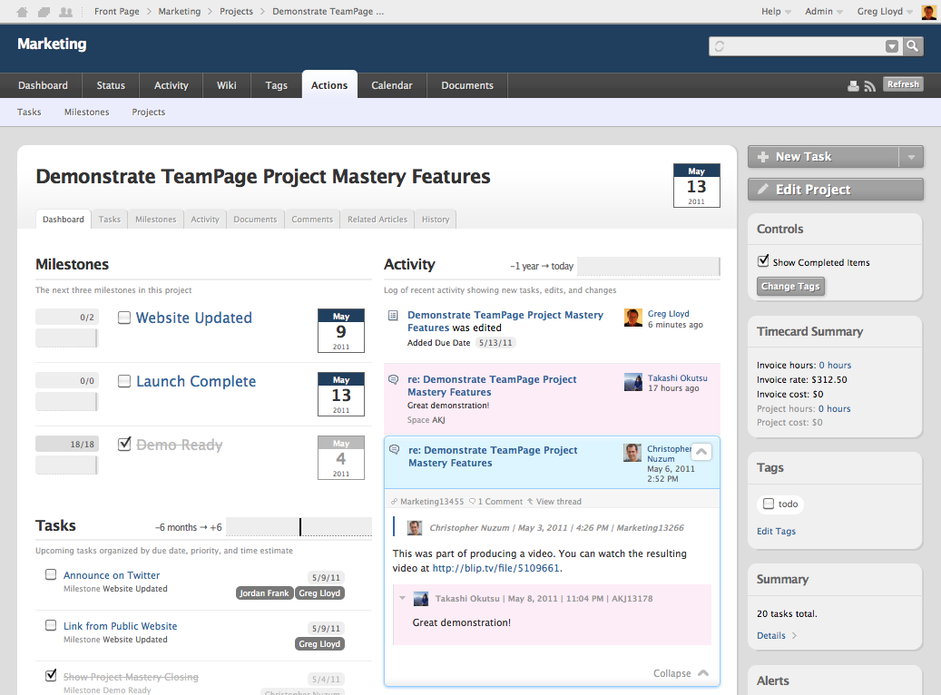 - Project Dashboards - Activity dashboard with milestones, tasks, recent activity, related articles and documents See Action Tracking videos