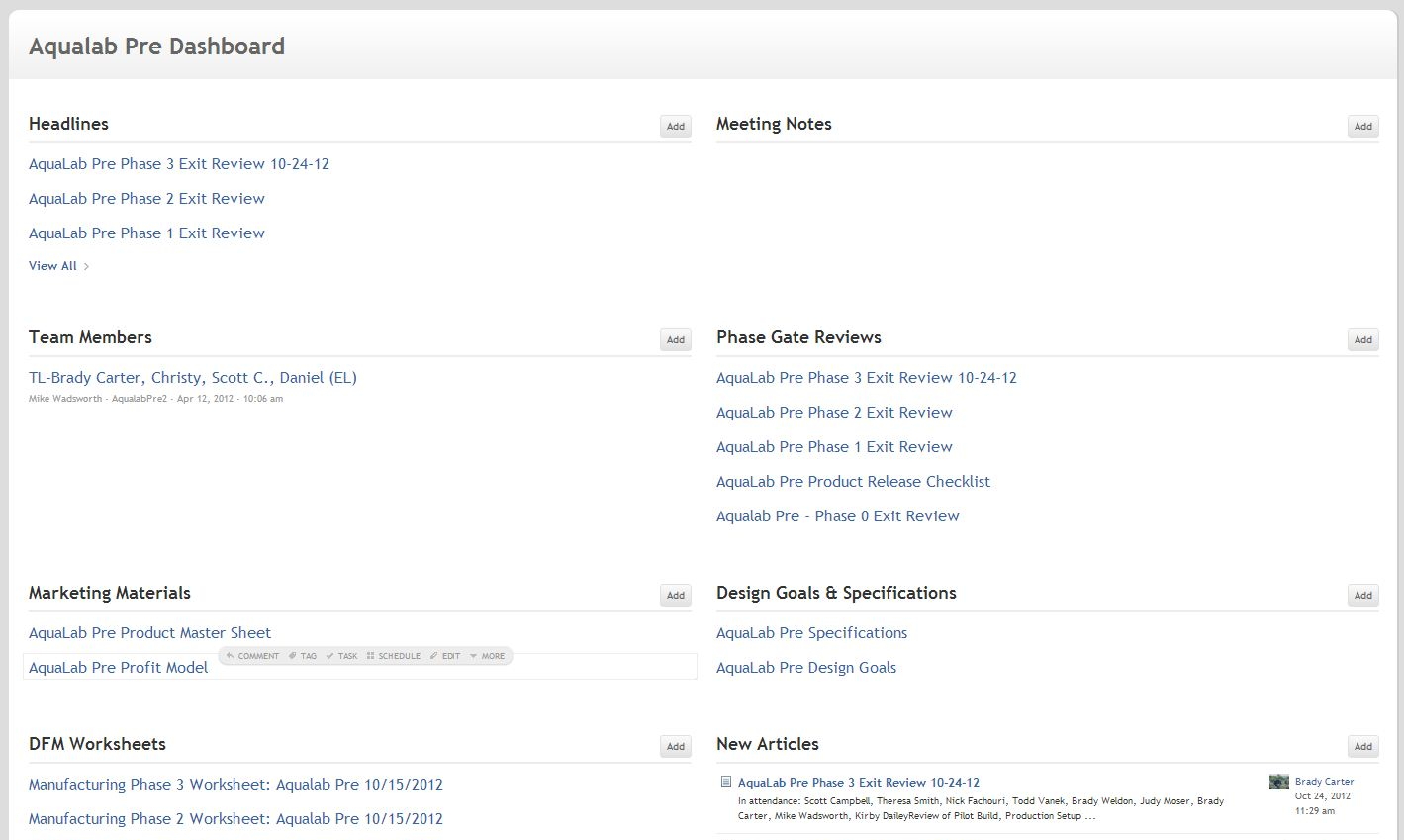 Product development goes beyond basic tasking to include capturing discussion and key actions throughout a product's lifetime. In the example (left), you see the TeamPage dashboard for the Aqualab product. This gives a bird's eye view of everything from design specs to marketing materials, phase gate reviews, meeting notes and team member roles. This makes it easy to keep up to date or bring a new team member on board.