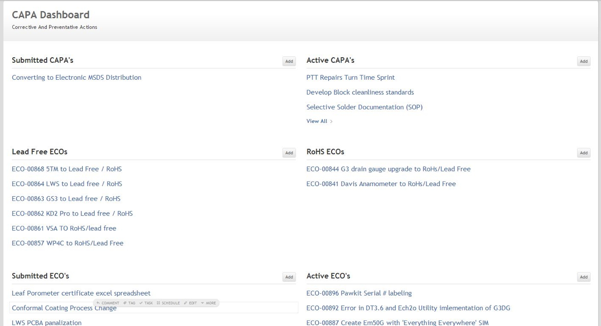 The Decagon-wide change management space is called CAPA. It has two key elements. First, a simple template for CAPAs and ECOs. Second, a CAPA dashboard used to submit a change request. The Add button pops up a TeamPage template developed by Decagon that's easy for anyone to understand and track as it moves through the CAPA process.