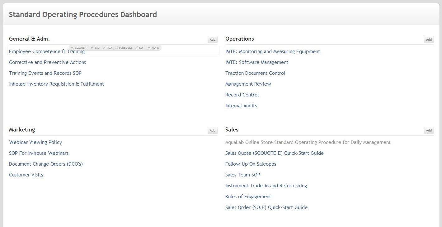 Standard Operating Procedures (SOPs) describe Decagon procedures in Marketing, Sales, Administration, Customer Support as well as Engineering and Operations. As part of Decagon's Quality Management initiative, all SOPs are now written, reviewed and used as living TeamPage articles. Printed copies of standard operating procedures, work instructions and similar materials are considered obsolete.