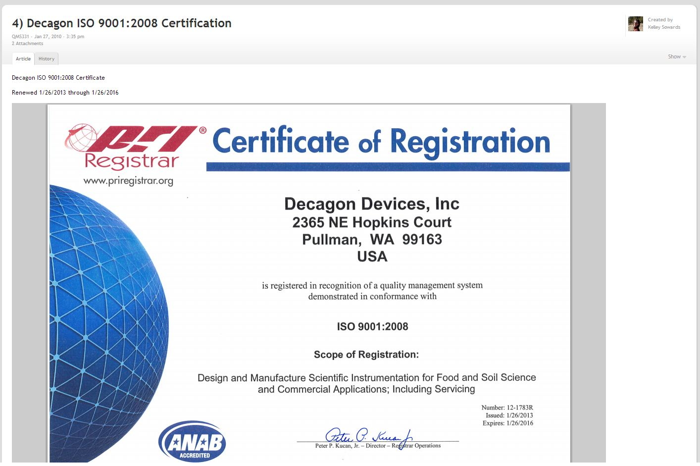 Decagon Devices recently completed a three year renewal of their ISO certification. Their certification recognizes “their quality management system demonstrated in conformance with ISO 9001:2008.” TeamPage is at the heart of the quality management system. Decagon's ISO 9001 certificate is posted into their Quality Management System space along with other key lean manufacturing (LMS), Quality Management and ISO related information and meeting agendas.