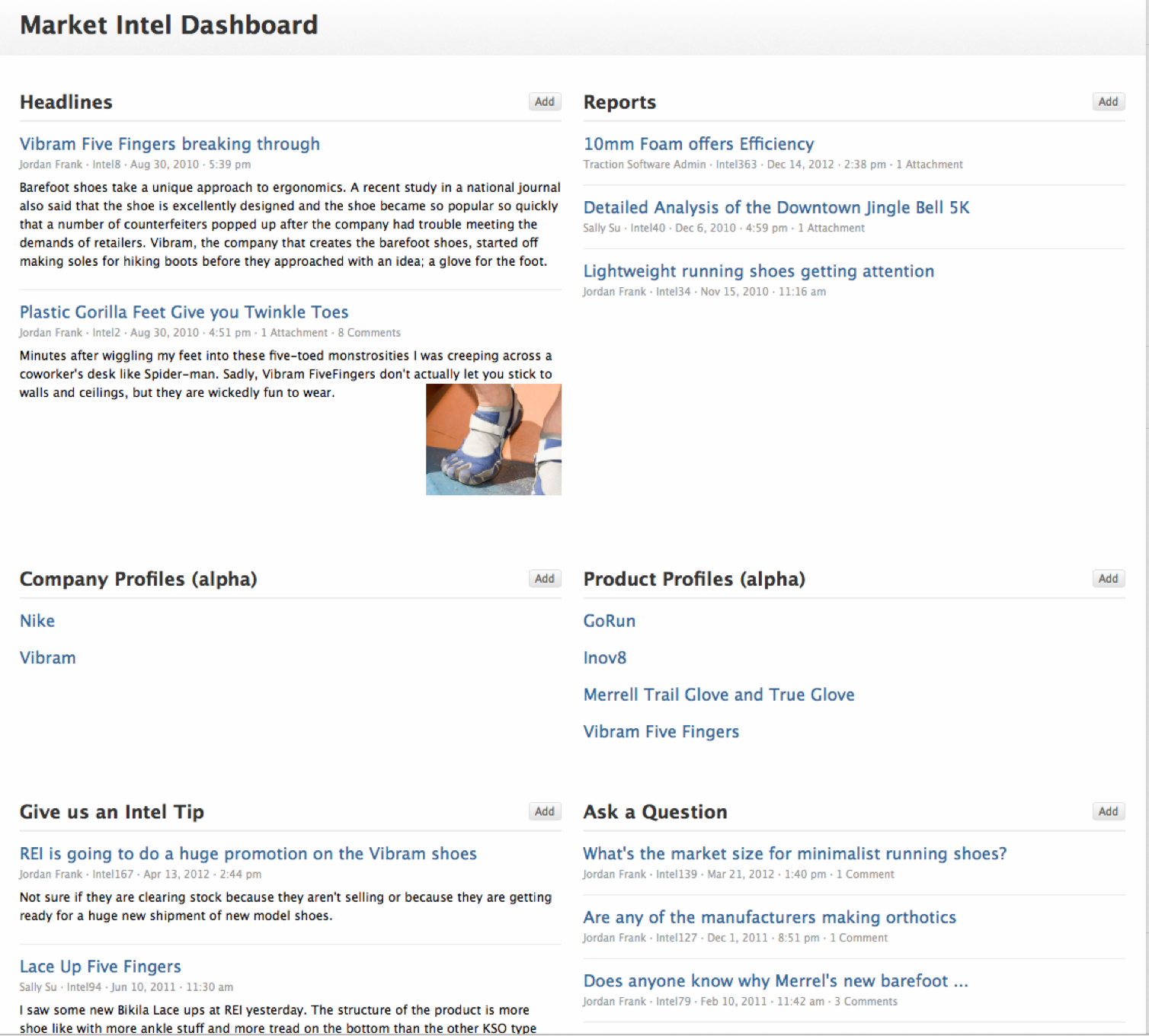 TeamPage spaces may be focused on providing intelligence to exec teams, product managers or entire communities that focus on a market area. The dashboards for each space may include top headlines, the team's own reports, competitor profiles and sections to share intelligence or ask questions.