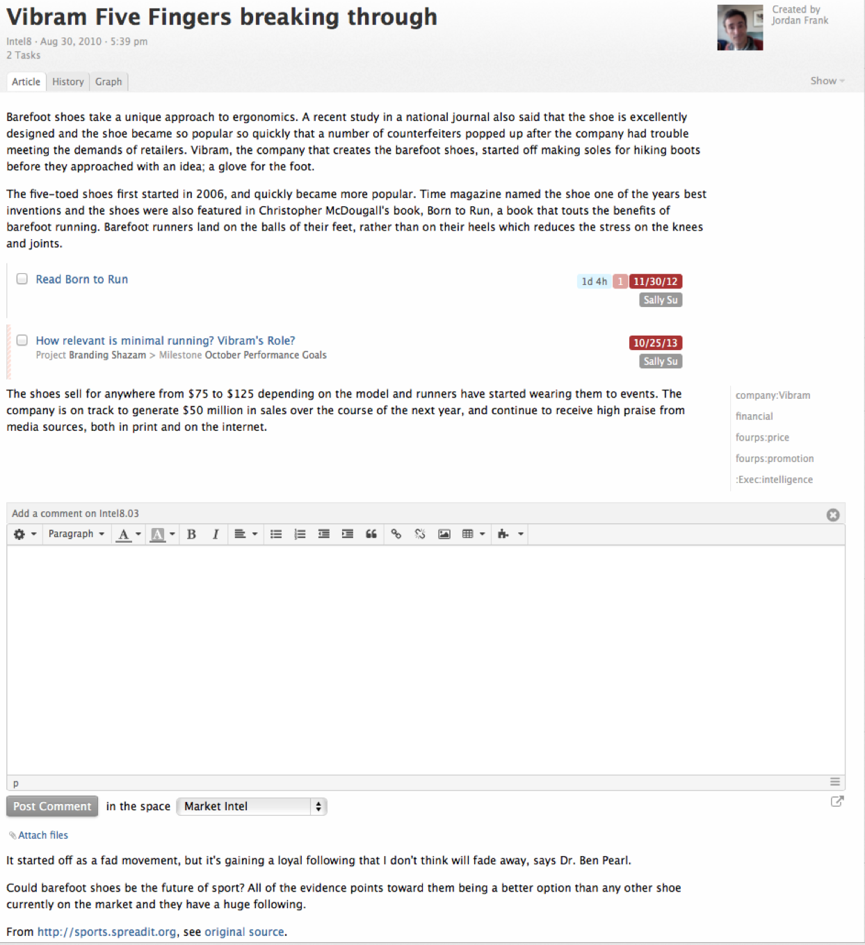 Once posted, an article or other piece of intelligence information offers opportunities for follow-through. A particular paragraph, as shown below, may require follow-through so you can just assign a task, or two. Another paragraph may have key information which can be tagged. And you can comment anywhere throughout the entry too.